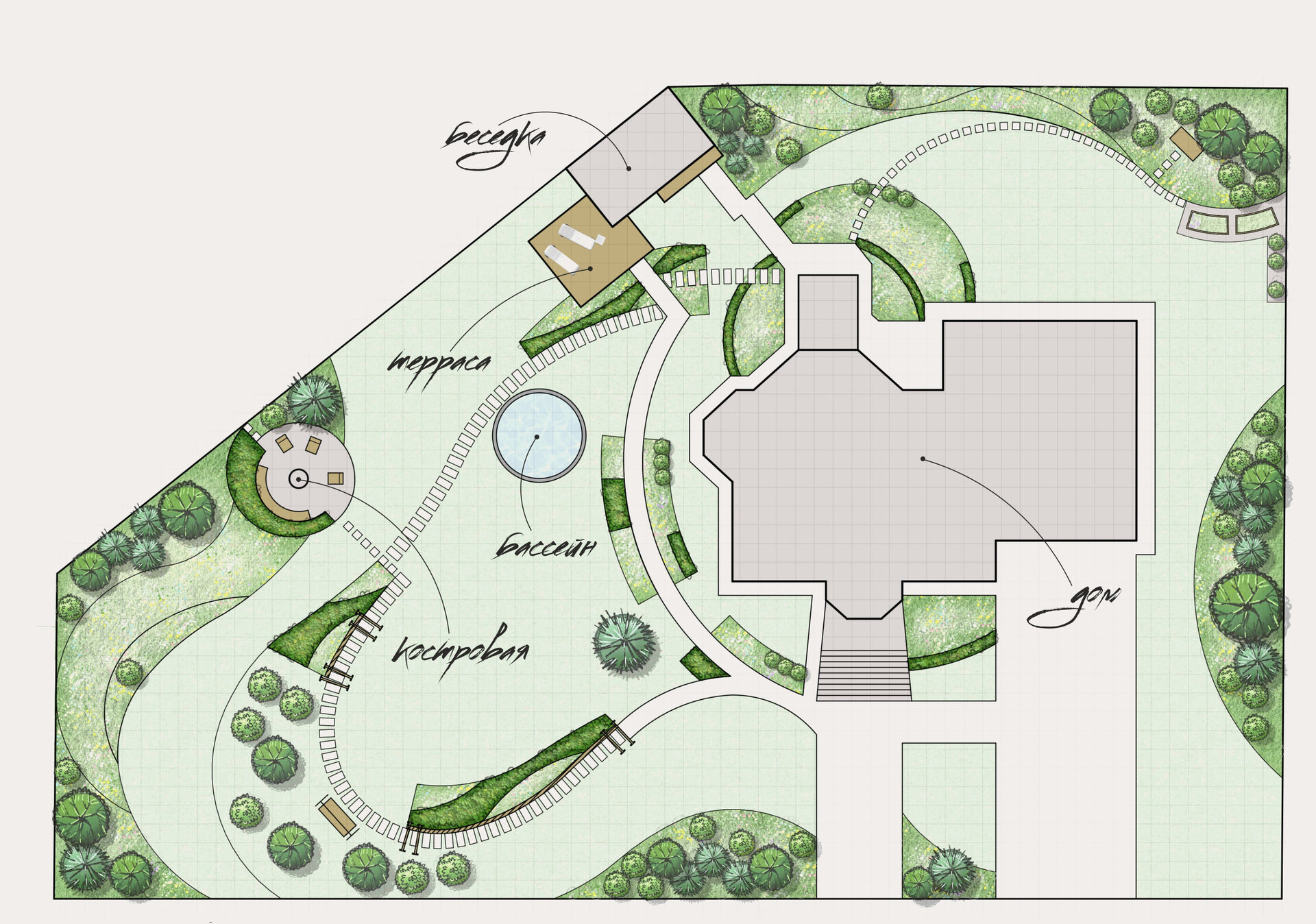 Путешествие по саду. Главная идея проекта — это прогулка по саду, поэтому было создано несколько вариантов движения с различными видовыми точками, акцентными цветниками вдоль дорожек, системой пергол сквозь которую видно геопластику и массив из злака.